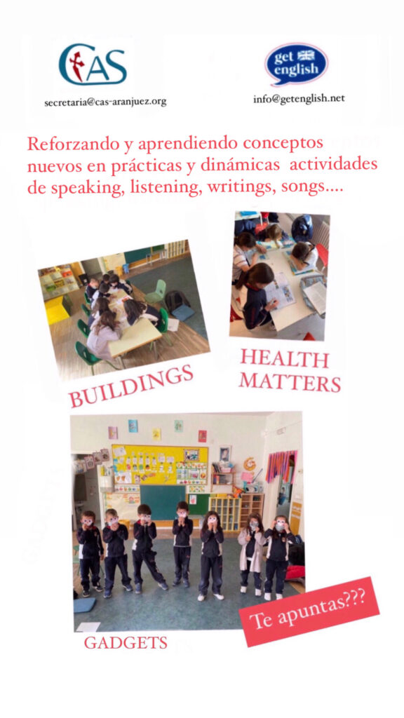 Desde hace años, desde el centro y en coordinación con el Centro de Formación de Idiomas «GET ENGLISH» proponemos la actividad extraescolar «Taller de Inglés. Conversación» como una acción destinada a la mejora de la comunicación escrita y oral en inglés. Trabajamos en pequeños grupos adaptados a la edad y al nivel comunicativo, incorporando una dinámica de aprendizaje activa y participativa. Además, fomentamos la preparación de exámenes de Cambridge (YLE, KET, PET y FCE). Muchos alumnos valoran muy positivamente este espacio de aprendizaje, complemento de la formación impartida por el centro. ¿Quieres conocernos? ¿Te apuntas?