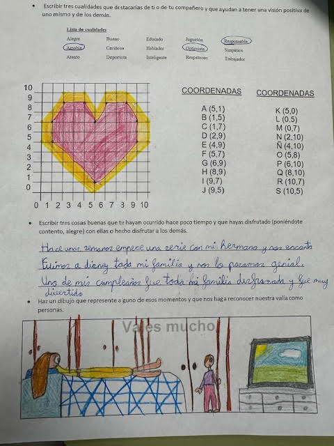 La última parte, «Tres cualidades positivas», animó a los alumnos a identificar y compartir sus propias virtudes. Al elegir tres cualidades positivas de una lista proporcionada, los estudiantes reconocieron la importancia de valorar no solo sus propias fortalezas, sino también las de sus compañeros. La lista incluía cualidades como ser alegre, amable, atento, deportista, inteligente, entre otras.