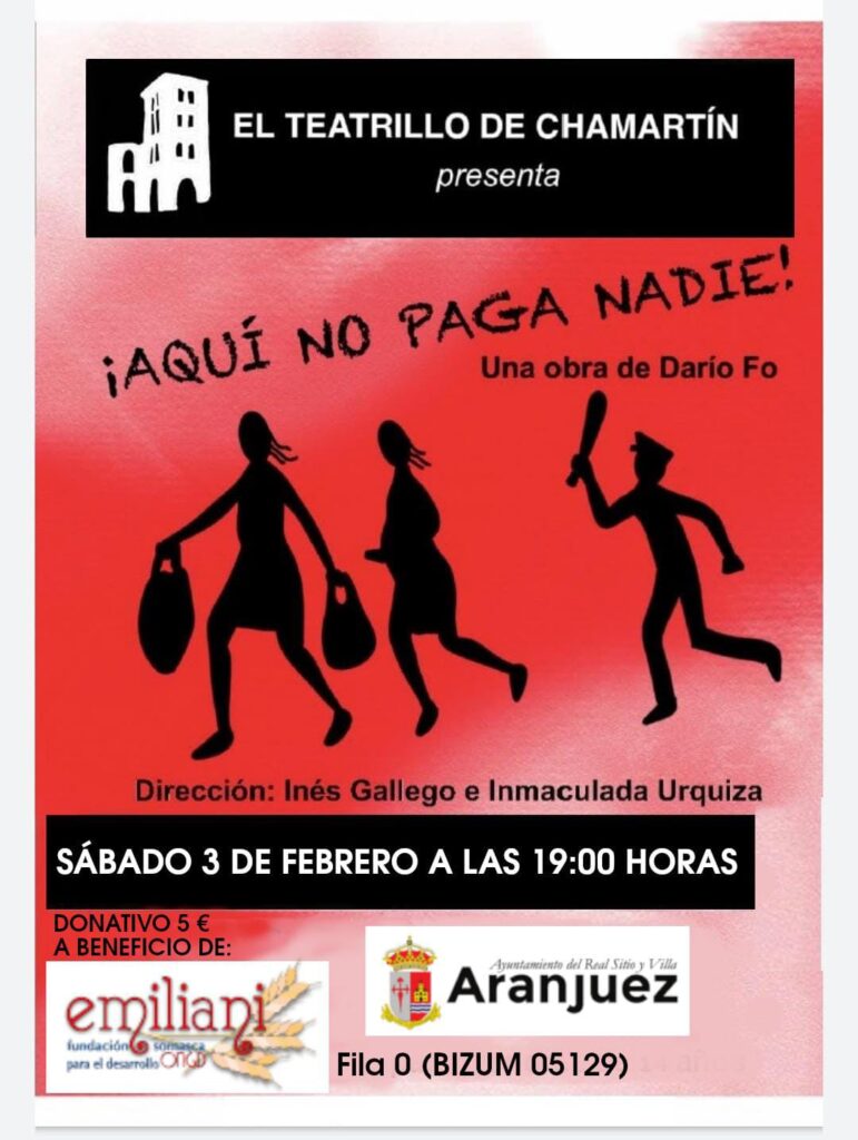 - Sábado 3 de febrero, a las 19:00 horas: ‘Aquí no paga nadie’. Recaudación a beneficio de ONG Emiliani Fundación Somasca. Dirección: Inés Gallego e Inmaculada Urquiza. Sinopsis: La presión social que resulta de las penurias económicas provocadas por la crisis y la inflación.