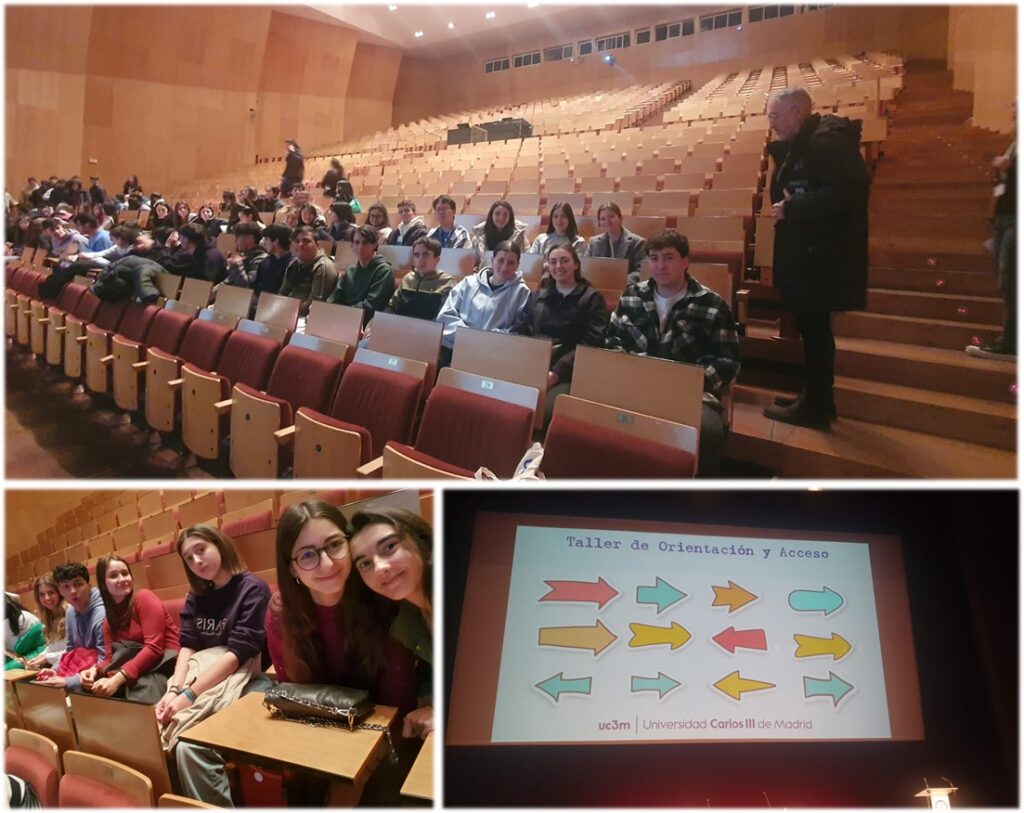 Los alumnus de 2º de Bachillerato han asistido a una charla realizada por el vicerrector de la Universidad Carlos III del campus de Leganés. Allí han visitado los diferentes edificios donde realizarán la EvAU a partir del 3 de junio. Les han informado de cómo serán dichos exámenes y les han dado consejos para que afronten esas pruebas con la máxima tranquilidad.