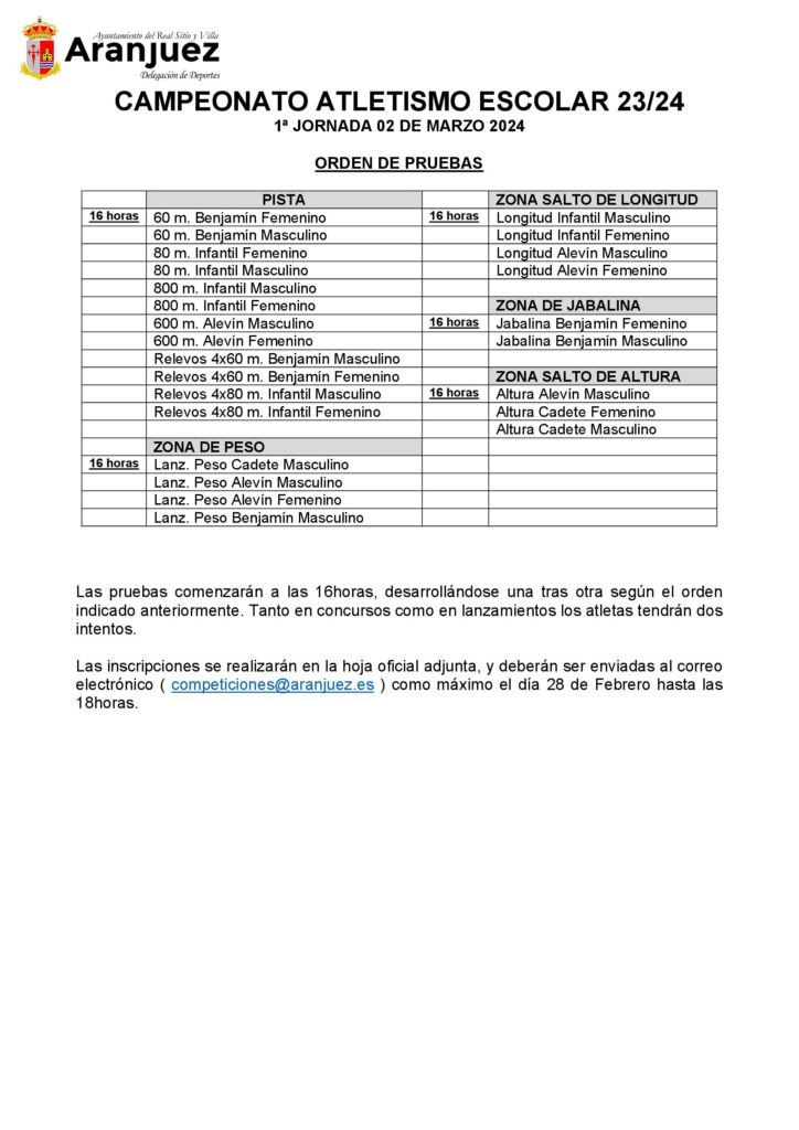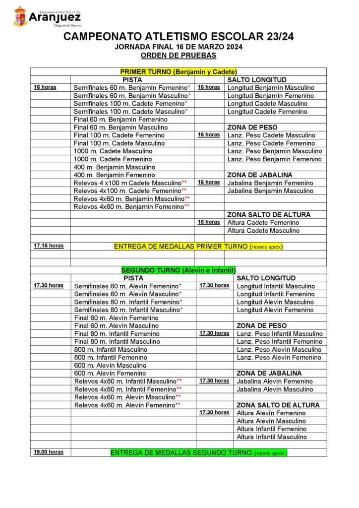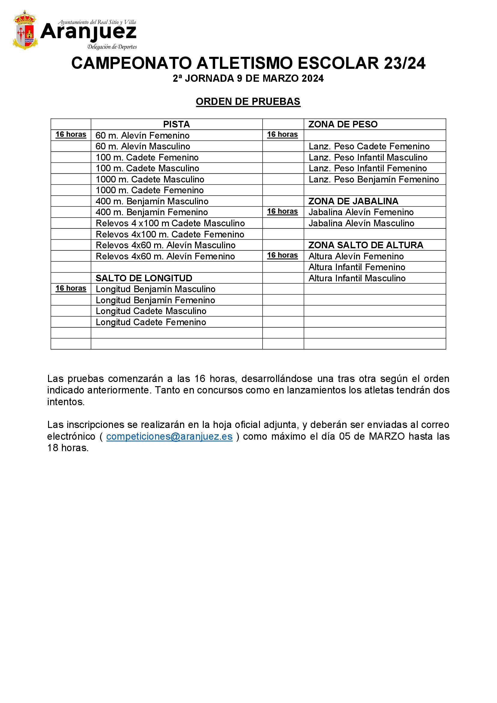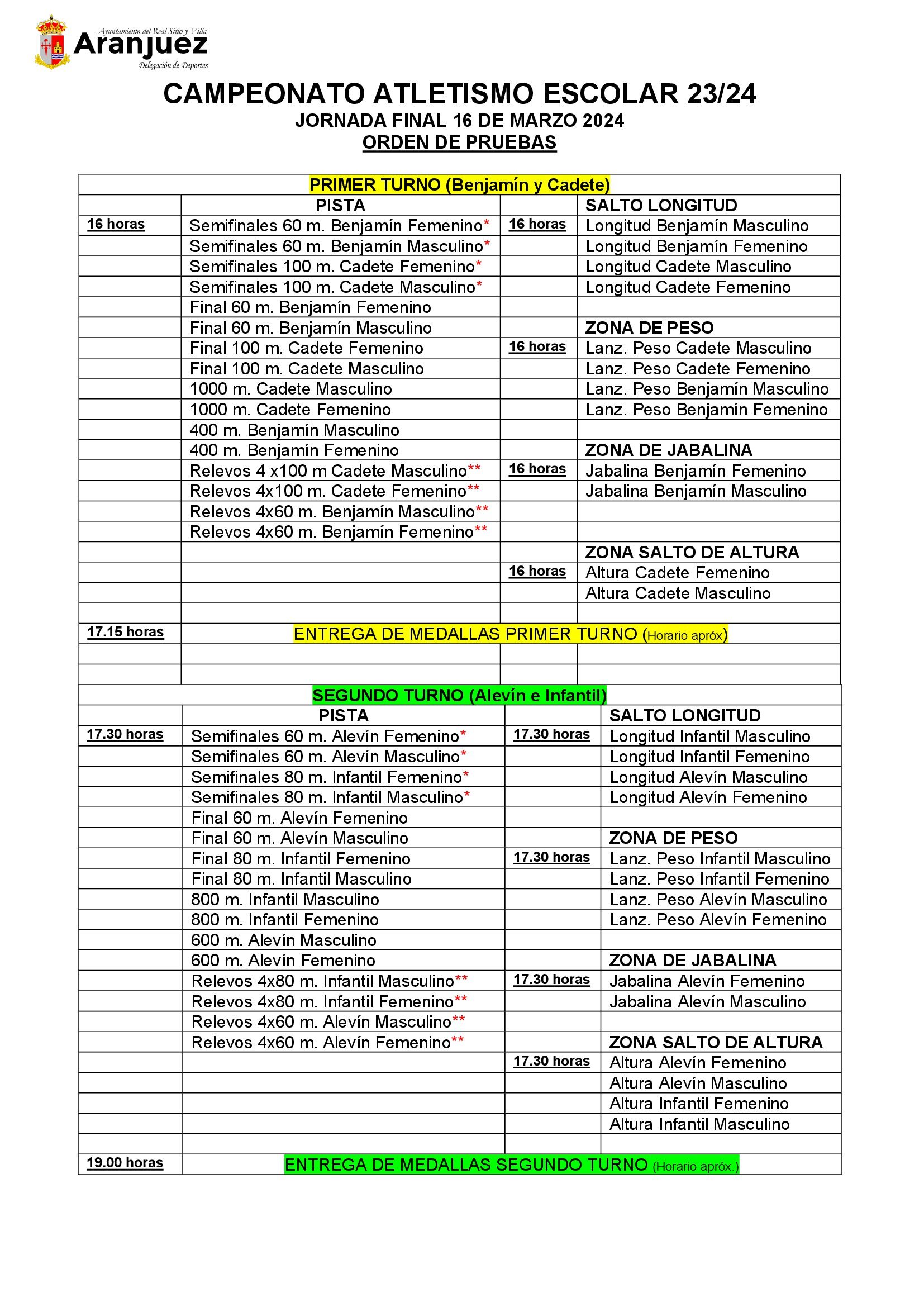 Una vez más, las instalaciones del Estadio municipal de deportes «El Deleite» volverán a acoger tanto las jornadas clasificatorias como la gran final de ATLETISMO ESCOLAR entre los centros educativos de Aranjuez. Los sábados 16 de marzo y 6 de abril tendrán lugar las pruebas de clasificación. La mejor marca en benjamín y alevín y las dos mejores marcas en infantil y cadete serán las encargadas de representar a su centro en cada una de las pruebas que tendrán lugar en la jornada final del día 13 de abril.