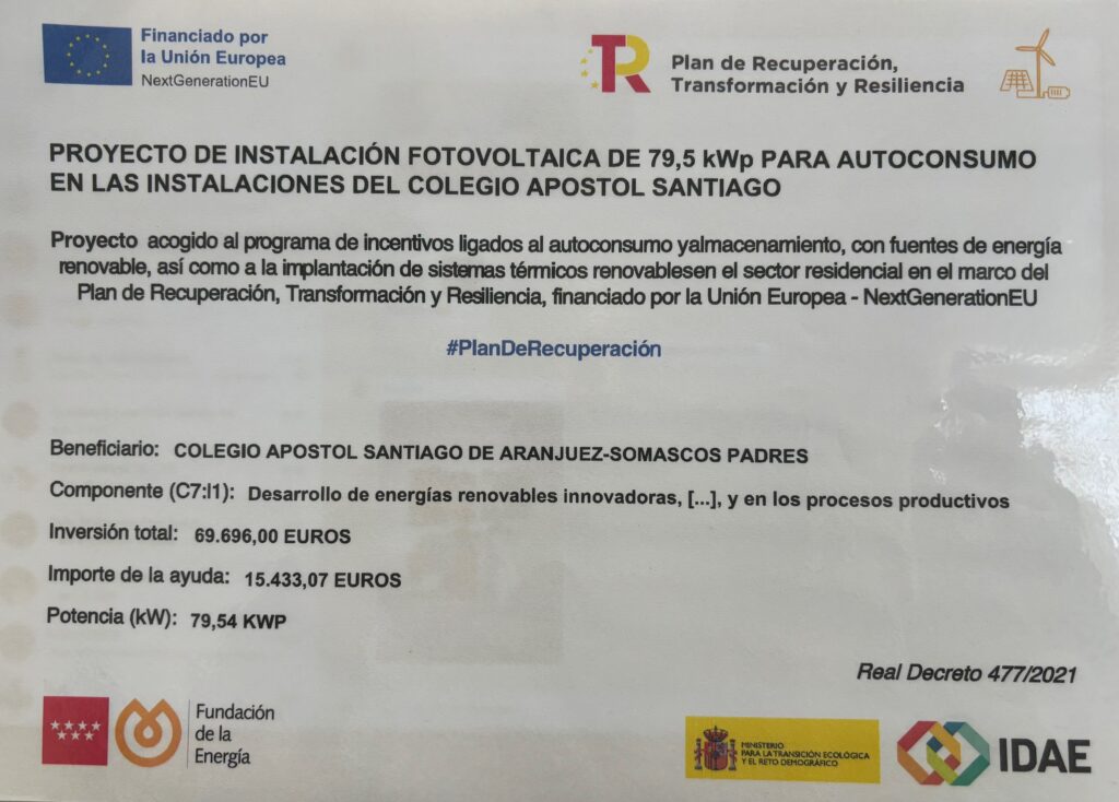 El Colegio Apóstol Santiago ha instalado una planta fotovoltaica para autoconsumo fotovoltaico con la ayuda de los fondos europeos Next Generation EU. La instalación fotovoltaica cuenta con una potencia de generación de 79,5 KWP (Kilovatios pico) y una potencia nominal de 80 KWN (Kilovatios nominales)