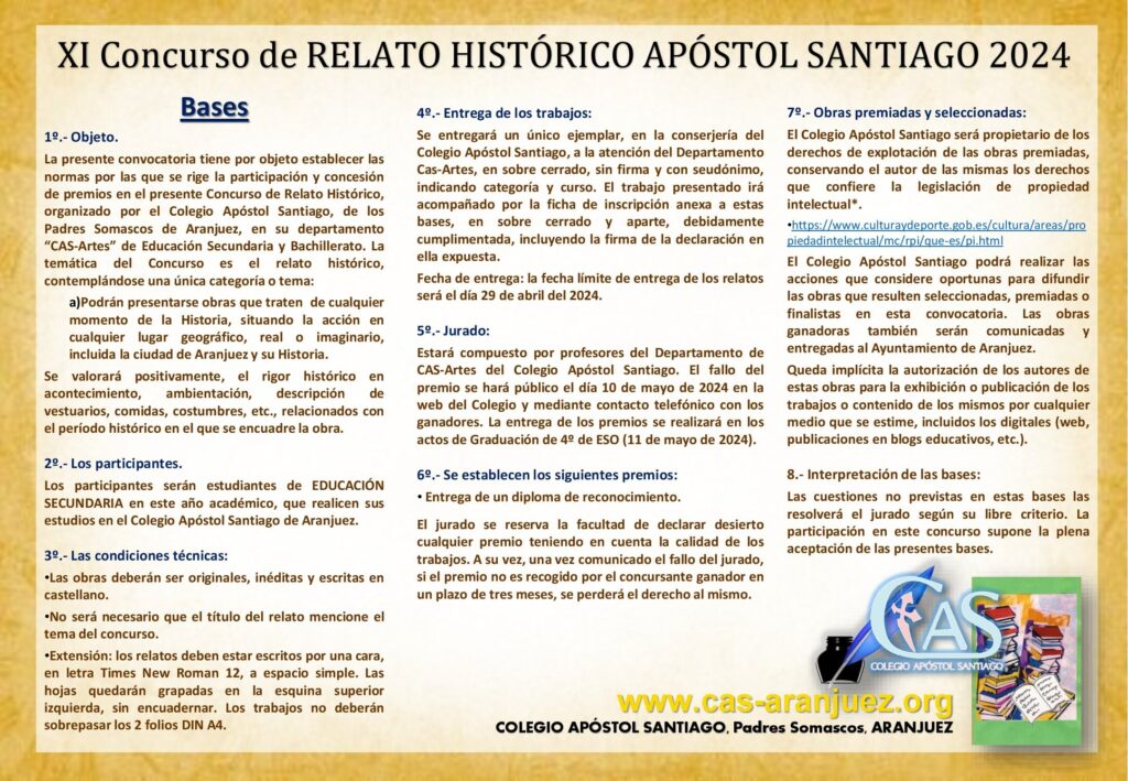 Os presentamos el Concurso de Relato Histórico Apóstol Santiago, ya en su 11ª edición, organizado por el Departamento de CAS-Artes de ESO y Bachillerato. Convocamos a la participación con la entrega de relatos históricos originales al alumnado que en este año académico 2023-2024 curse Educación Secundaria en el Colegio Apóstol Santiago de Aranjuez. En esta edición se contempla una única categoría para el desarrollo de las obras: Historia, situando la acción en cualquier lugar geográfico, real o imaginario, incluida la temática ribereña (historia de Aranjuez). Se valorará positivamente, el rigor histórico en acontecimiento, ambientación, descripción de vestuarios, comidas, costumbres, etc., relacionados con el período histórico en el que se encuadre la obra. Recordad que la fecha tope de entrega será el 29 de abril. Aquí tenéis las bases del concurso con las condiciones técnicas, la ficha de inscripción, los plazos, los premios por categoría de curso y temática, etc. Leedlas, ¡y participad!