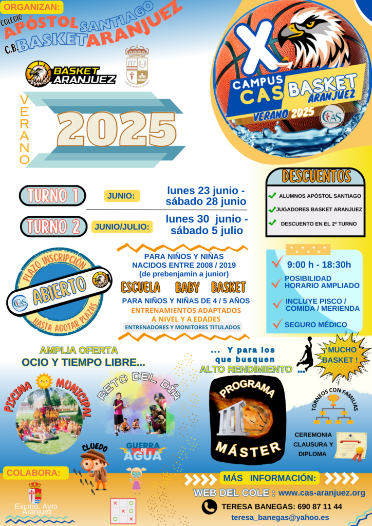 Os presentamos el 10º CAMPUS CAS – BASKET ARANJUEZ 2025, organizado por el Colegio Apóstol Santiago y el Club Basket Aranjuez.