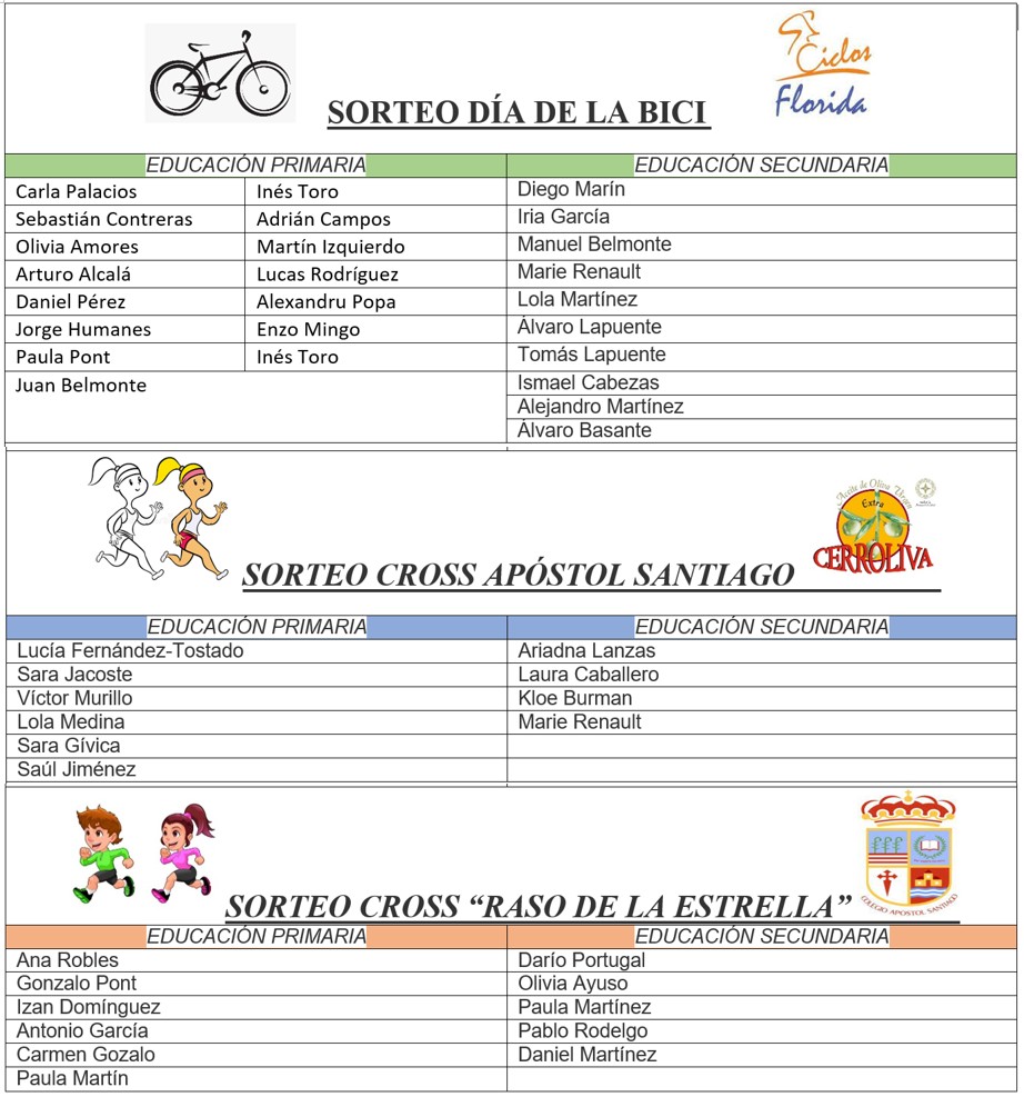 Una de las señas de identidad del Colegio es la firme apuesta por la promoción del deporte entre nuestros alumnos. Gracias al esfuerzo del propio centro, a patrocinadores que continúan su idilio con el deporte escolar y a otros que se van uniendo a esta apuesta, podemos llevar a cabo sorteos de material deportivo, de ocio y de alimentación que anima a la participación de nuestro alumnado. Gracias a estas entidades por su colaboración: Ciclos Florida (material de ciclismo), a Cerroliva (botellas de aceite) y al Colegio (entradas de cine).