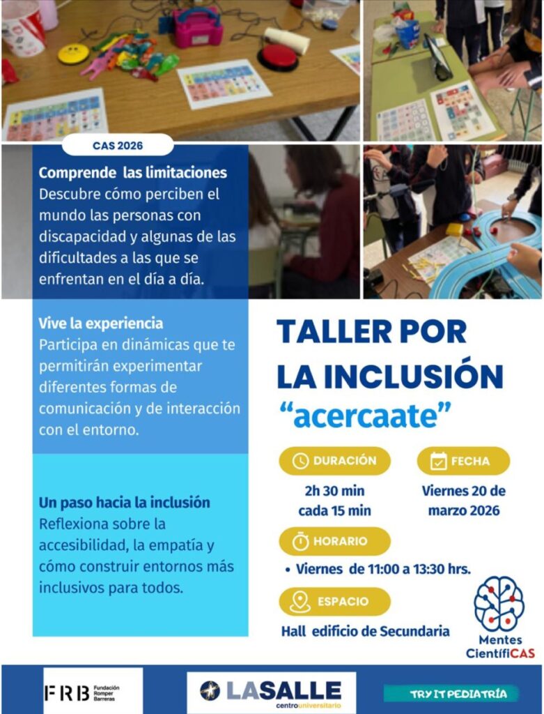 En el marco de la LXIV Olimpiada se ha celebrado un enriquecedor taller de concienciación para la inclusión en el vestíbulo de Secundaria, promovido por los alumnos pertenecientes al proyecto “Mentes CientifiCAS”, donde numerosos alumnos tuvieron la oportunidad de participar y aprender de forma vivencial.