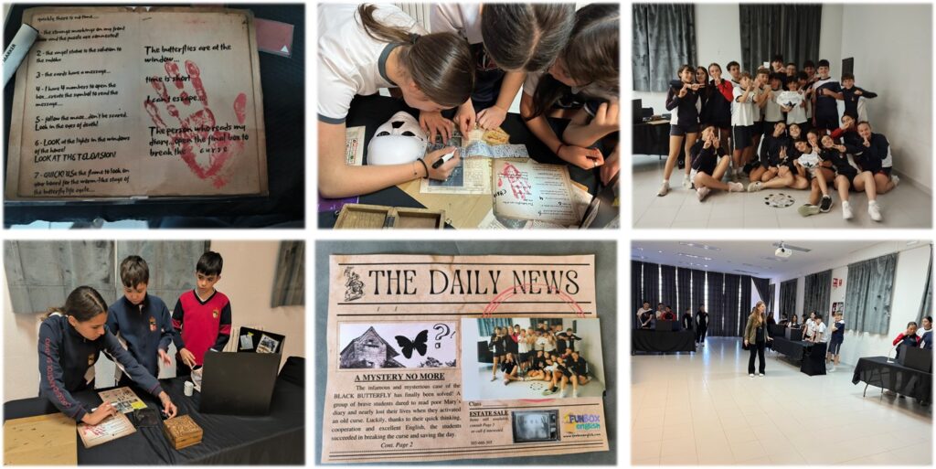 Hi everybody! Our students of first of ESO have taken part in an English Escape Room activity “Black butterfly”. The classroom was transformed into an interactive challenge where students worked together to solve puzzels and complete tasks entirely in English.